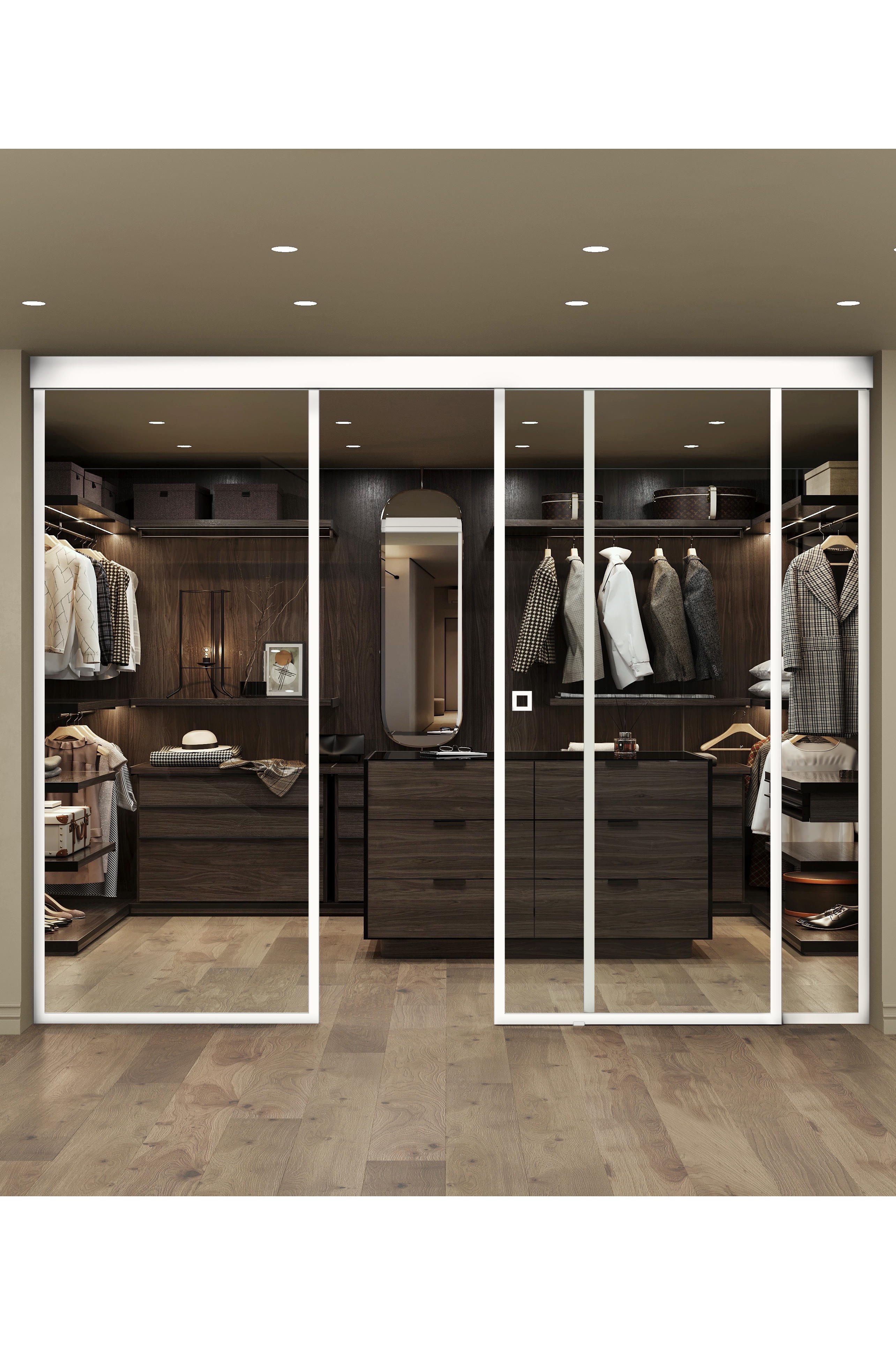 The sliding door with two fixed panels glass wall consists of fixed wall panels,a sliding door panel and ceiling mounted sliding mechanism. Sliding door fixture takes up very little space in the room, a quality sliding mechanism and a floor guide fitting provides a smooth and safe door movement. The doors are equipped with soft closing mechanism which cushions the closing and gently pulls the door into position.